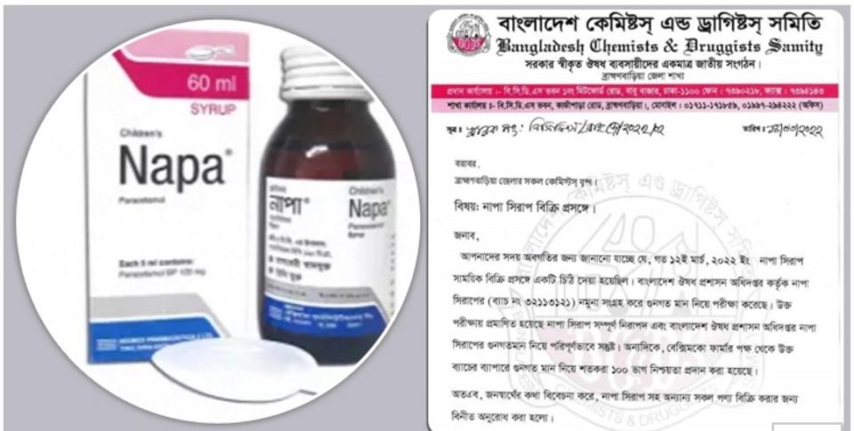 এর আগে গত শনিবার (১২ মার্চ) ব্রাহ্মণবাড়িয়া জেলা কেমিস্ট অ্যান্ড ড্রাগিস্ট সমিতি জেলায় নাপা সিরাপ বিক্রি বন্ধ রাখতে নির্দেশনা প্রদান করে।