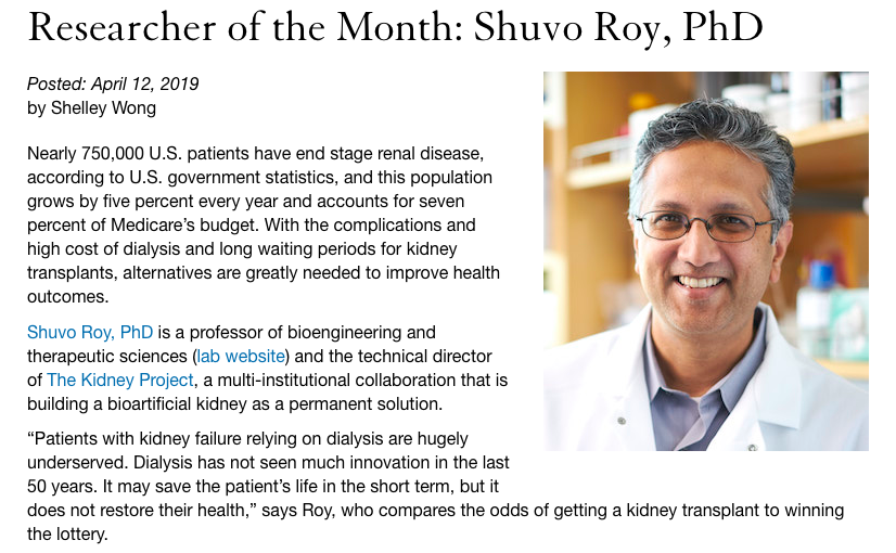 ক্যালিফোর্ণিয়িা বিশ্ববিদ্যালয়ের বিখ্যাত ওই প্রকল্পের নাম কিডনী প্রজেক্ট। সেখানে অবশ্য বাঙালি শুভ রয়ের সঙ্গে এই আবিস্কারে হাত লাগিয়েছেন নেফ্রোলজিষ্ট উইলিয়াম এইচ ফিসেল। এরই মধ্যে যুক্তরাষ্ট্রের বহু কিডনী বিকল রোগীর শরীরে স্থাপন করা হয়েছে কৃত্তিম এই কিডনী।