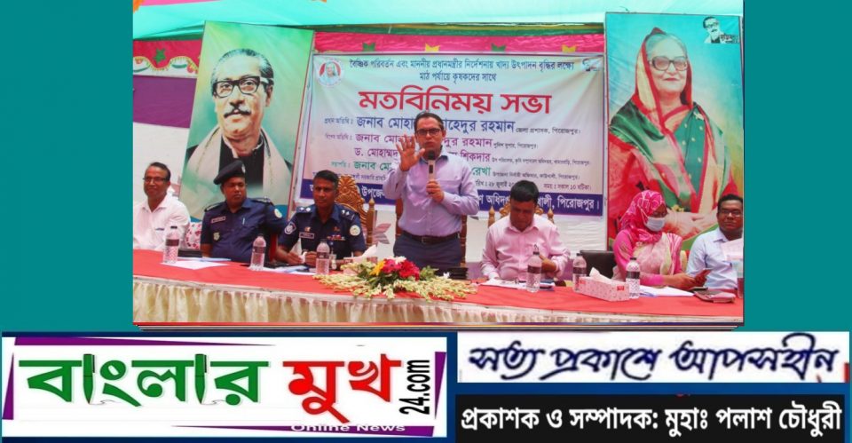 আজ বৃহস্পতিবার সকালে উপজেলার সাহাপুরা নাঙ্গুলী সরকারি প্রাথমিক বিদ্যালয় মাঠে উপজলো প্রশাসন ও কৃষি সম্প্রসারণ অধিদপ্তরের আয়োজনে উপজেলা নির্বাহী কর্মকর্তা মোছাঃ খালেদা খাতুন রেখার সভাপতিত্বে মতবিনিময় সভায় প্রধান অতিথির বক্তব্য রাখেন পিরোজপুর জেলা প্রশাসক মোহাম্মদ