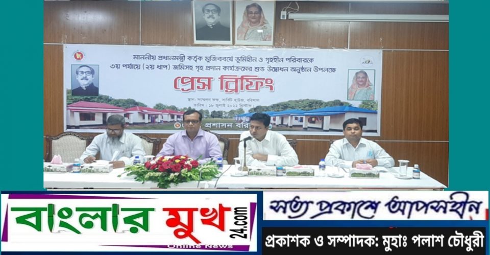 সংবাদ সম্মেলনে জানানো হয়, মুজিব বর্ষে একটি পরিবারও গৃহহীন এবং ভূমিহীন থাকবেনা বলে ঘোষণা দিয়েছেন প্রধানমন্ত্রী। এই লক্ষ্যে প্রথম পর্যায়ে ২০২১ সালের ২৩ জানুয়ারী বরিশাল বিভাগের ৪২টি উপজেলায় ৬ হাজার ৮৮টি এবং দ্বিতীয় পর্যায়ে একই বছরের ২০ জুন ৪২ উপজেলার ৭ হাজার ১শ’ ৫৩টি গৃহ ও ভূমিহীন পরিবারকে প্রধানমন্ত্রী কার্যালয়ের আশ্রয়ণ প্রকল্পের ঘর উপহার দেয়া হয়। তৃতীয় পর্যায়ের প্রথম ধাপে গত ২৬ এপ্রিল বিভাগে আরও ৩ হাজার ২শ’ ১০টি পরিবারকে দুই শতাংশ জমির উপর নির্মিত দুই কক্ষ বিশিষ্ট ঘর উপহার দেয়া হয়। তৃতীয় পর্যায়ের দ্বিতীয় ধাপে আগামী ২১ জুলাই জমি সহ ঘর দেয়া হবে আরও ৩ হাজার ৫শ’ ৫০টি গৃহ ও ভূমিহীন পরিবারকে। ওইদিন প্রধানমন্ত্রী ভিডিও কনফারেন্সের মাধ্যমে ঘর হস্তান্তর করবেন।